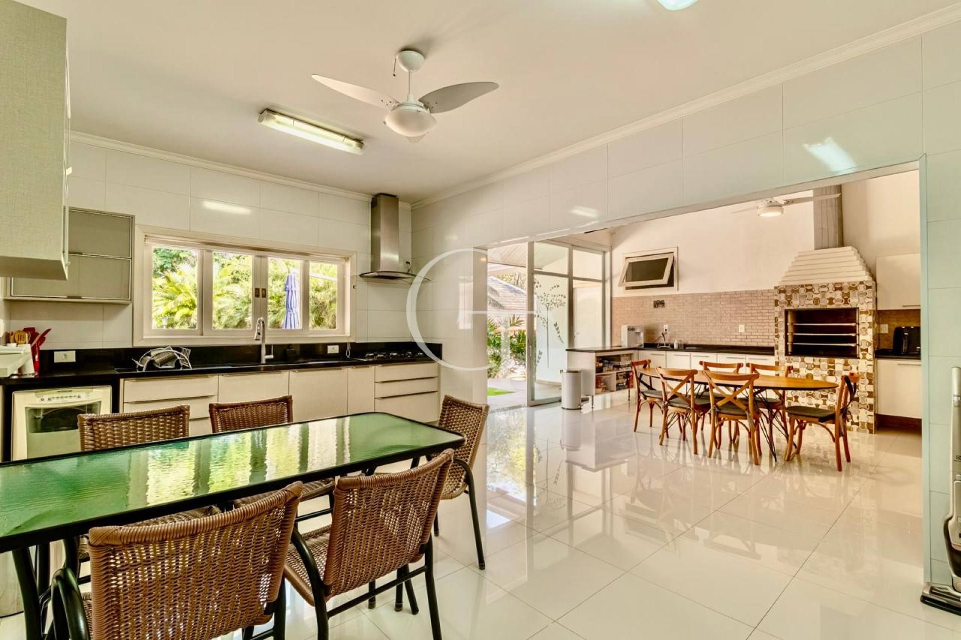O living, dividido em duas salas sociais uma de TV e outra de jantar cria o cenário ideal para receber com estilo. A cozinha planejada é funcional e acolhedora, conectando-se ao espaço gourmet com churrasqueira e à área externa com piscina ensolarada durante todo o dia.