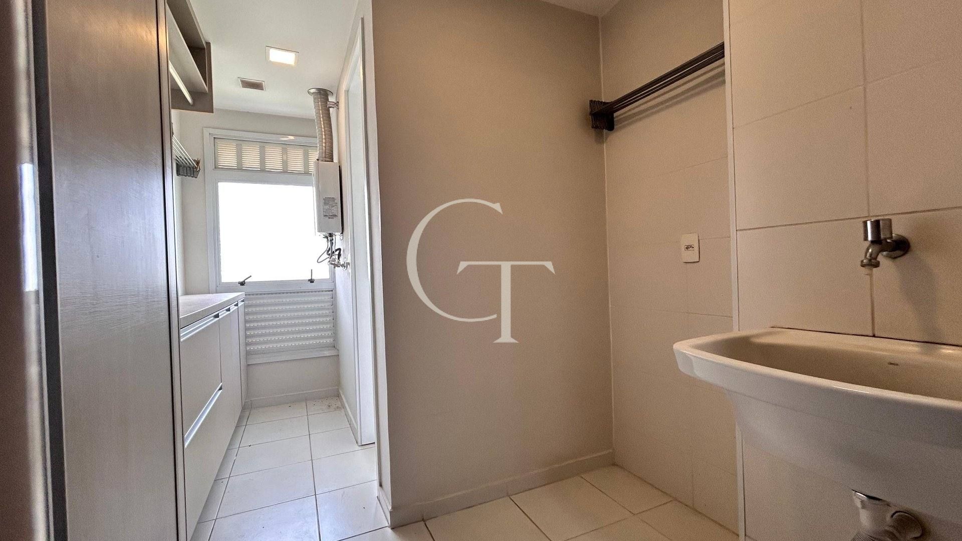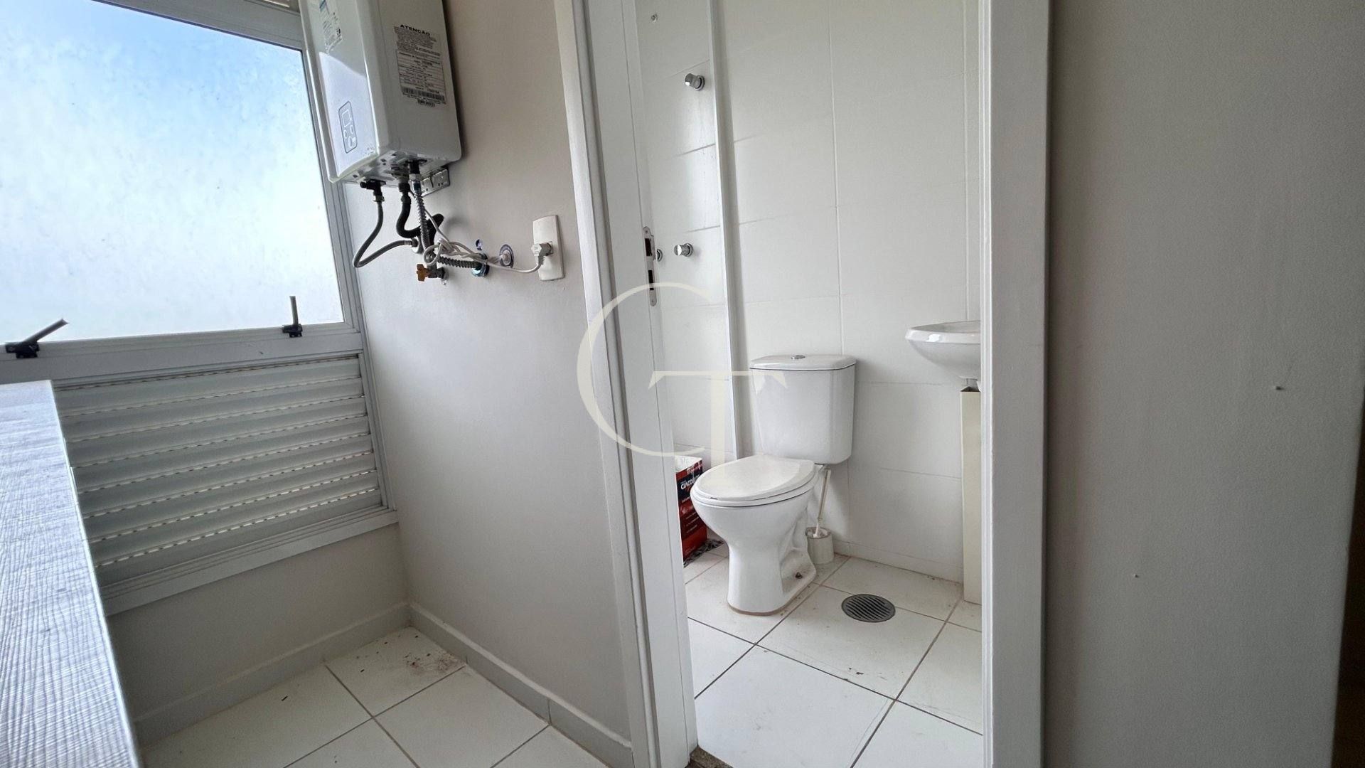 Lavanderia com armários e banheiro de apoio
