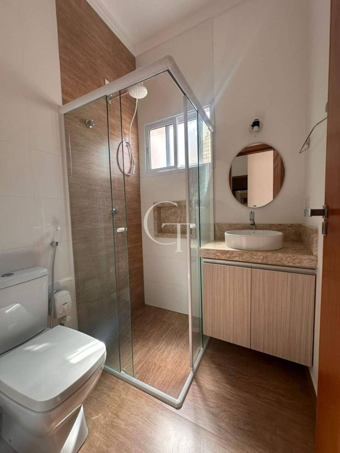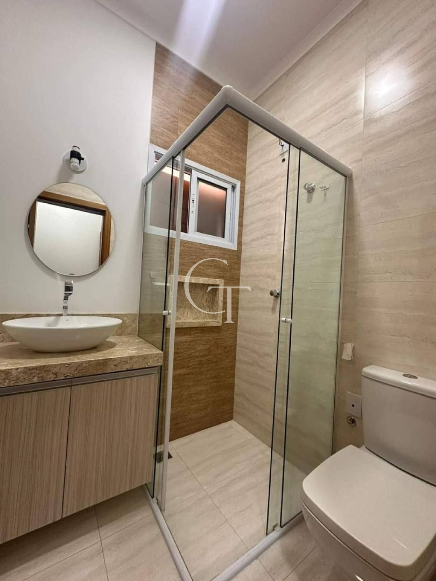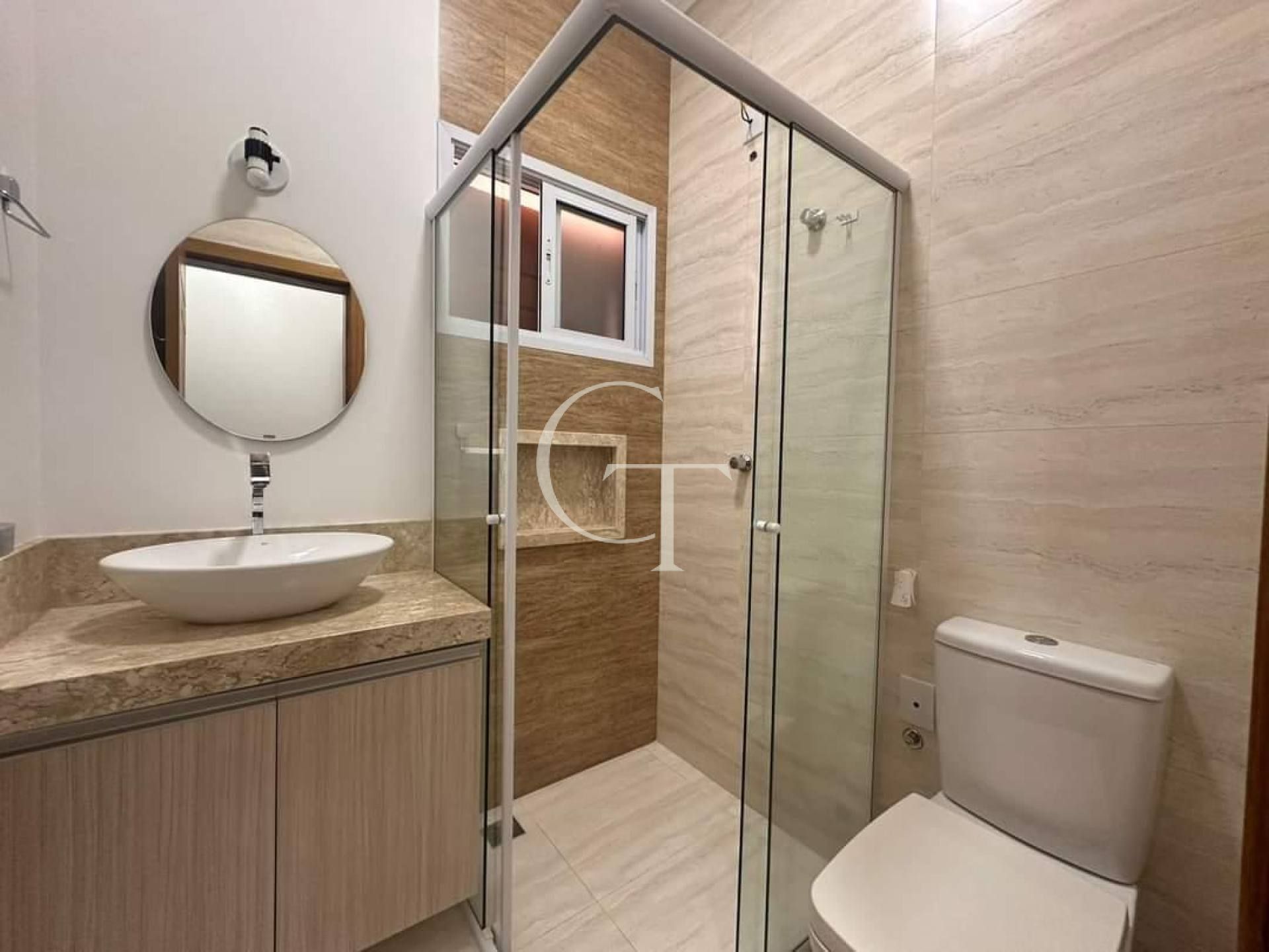 • Banheiro social com gabinete, bancada em granito, box e porcelanato acetinado