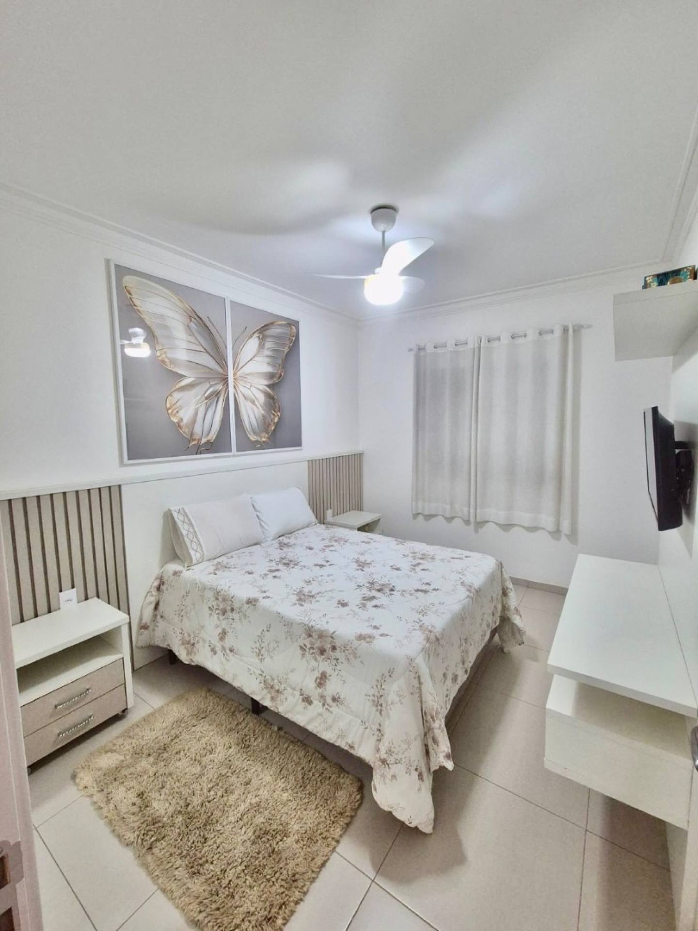 O imóvel conta com 2 dormitórios com móveis planejados, sendo 1 suíte, garantindo mais privacidade e comodidade. A sala é aconchegante e bem distribuída, equipada com painel de TV, integrada a um espaço de jantar elegante com mesa, além de um armário planejado multifuncional com adega climatizada e espaço dedicado para café, perfeito para momentos de relaxamento ou para receber visitas.