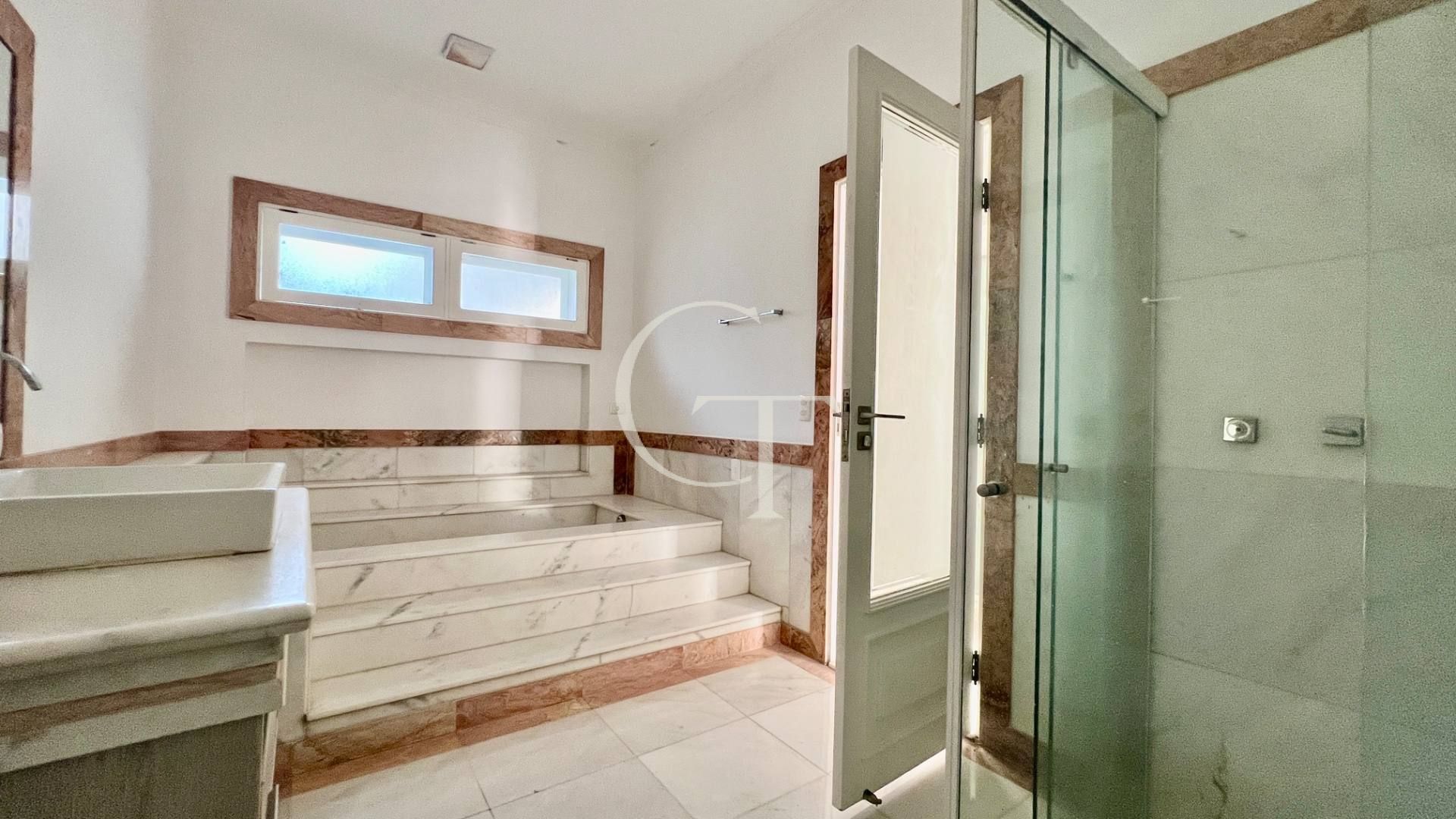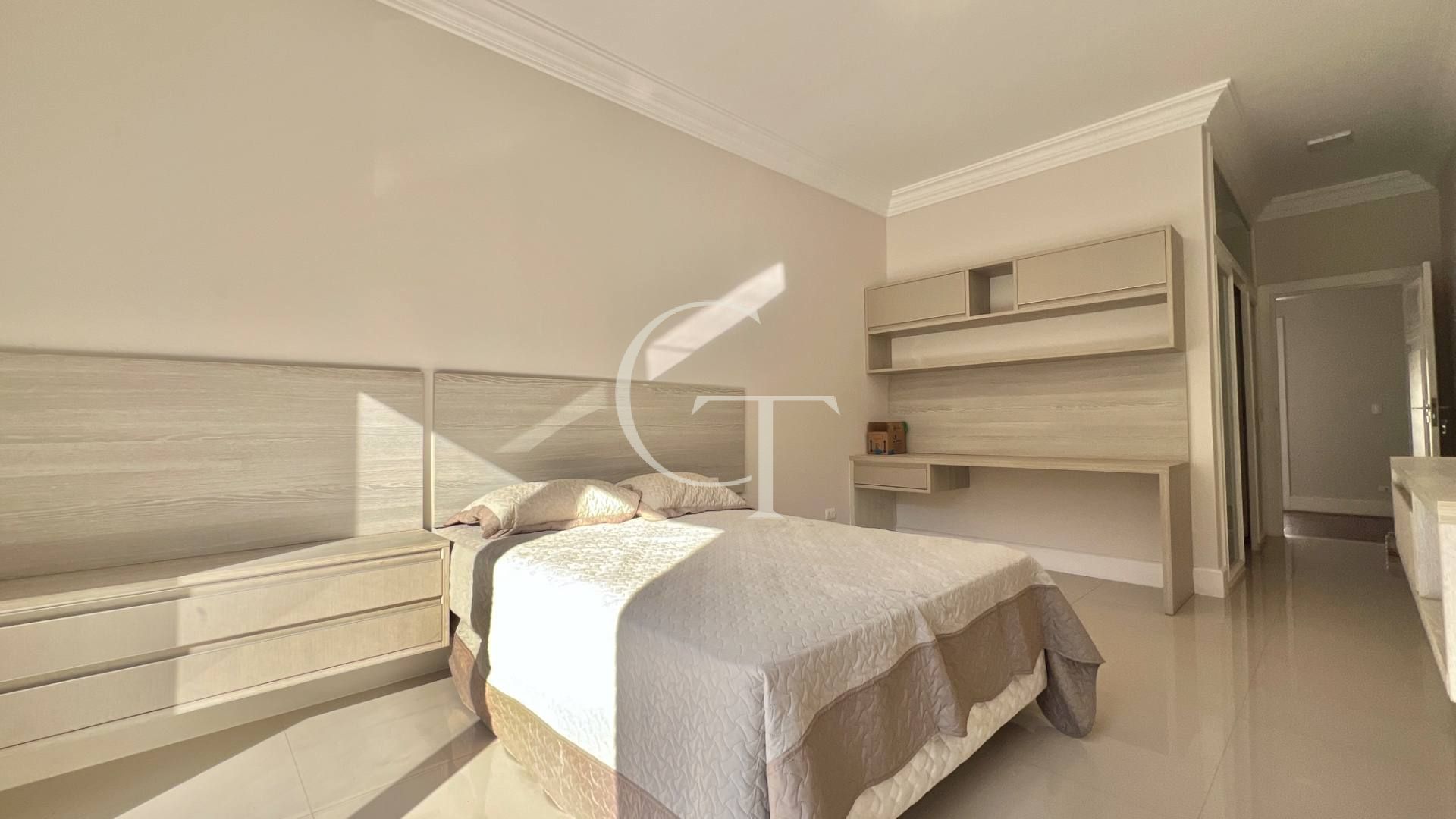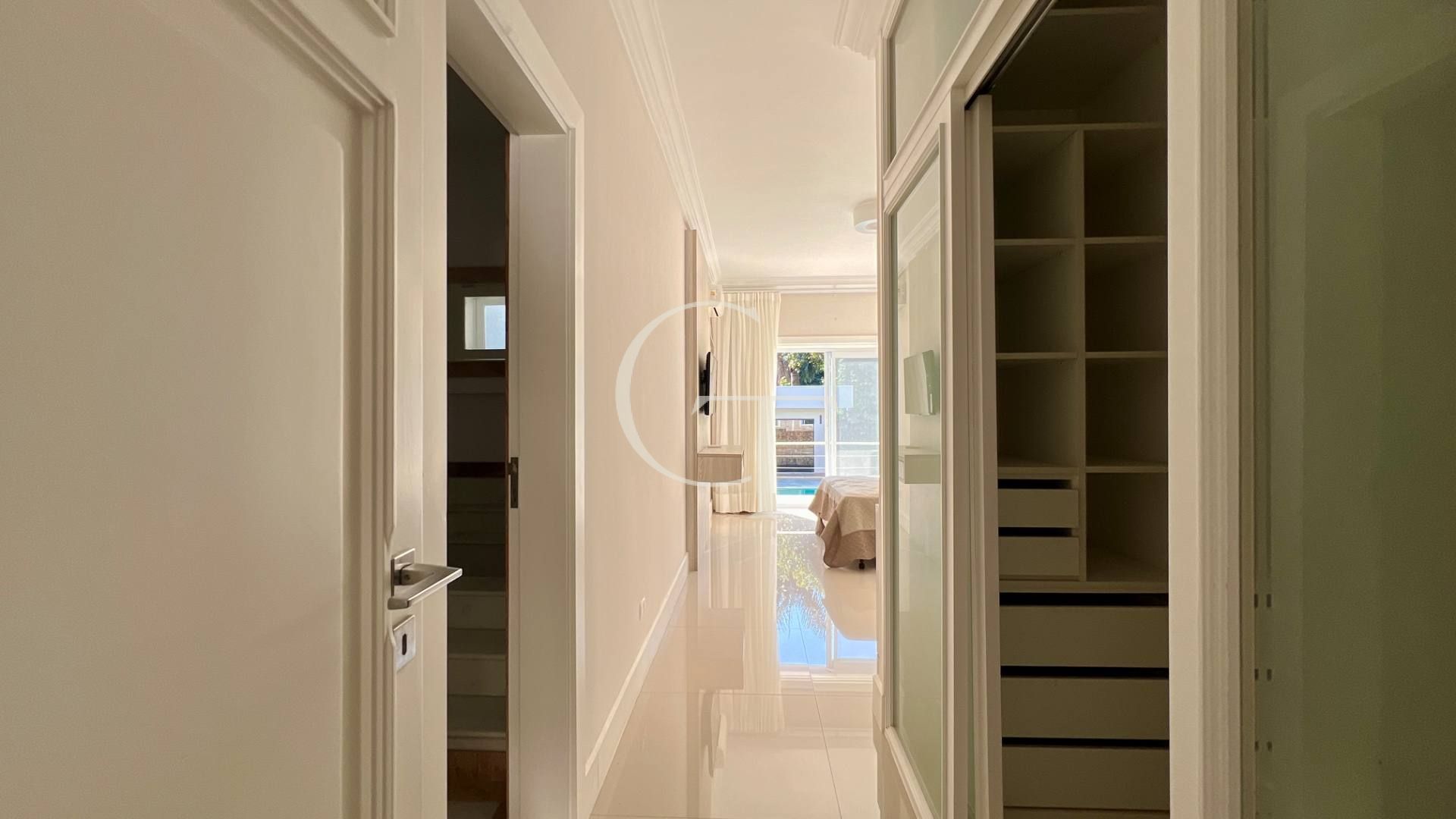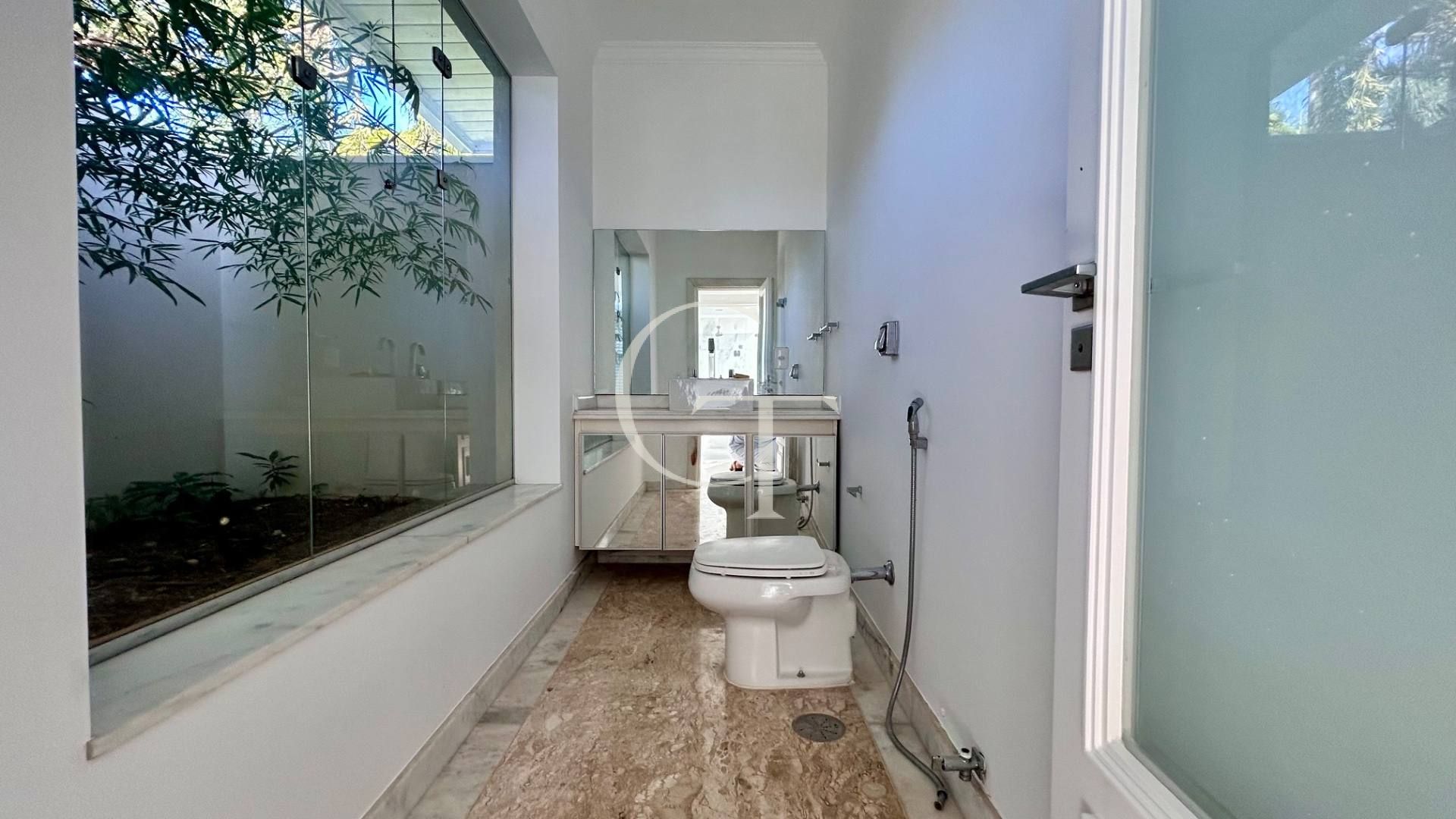 São 2.200 m² de construção em um terreno de 4.588 m². Nove dormitórios, sendo cinco suítes. A suíte master se impõe com closet duplo e sala de banho. Demais suítes com varandas e enquadramentos privilegiados do paisagismo e do lago.